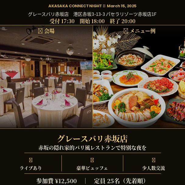日時2025年3月15日(日)18:00〜20:00(受付17:30〜)会場グレースバリ赤坂店住所〒107-0052 東京都港区赤坂3丁目13-3 パセラリゾーツ赤坂店1F最寄駅東京メトロ千代田線 赤坂駅 徒歩約5分参加費12,500円定員25名(先着順)