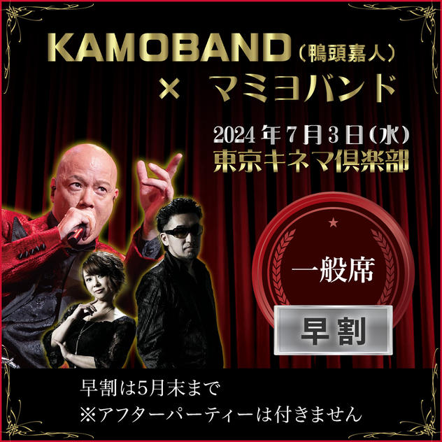 7月3日(水)東京キネマ俱楽部で行われるKAMOBANDとマミヨバンドの2マンライブの一般席参加権です。チケットの発券は行いませんので、当日受付でお名前をお伝えください。※こちらは5月末までの期間限定・早割り価格での販売となります。