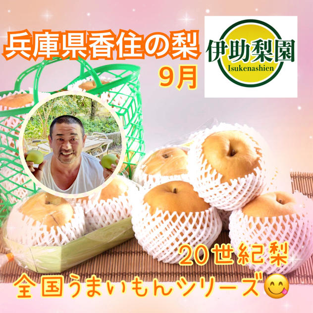 提携農家さん提供による「全国うまいもんシリーズ」です。香住はカニだけではないんです。兵庫県の北部日本海に面した香美町香住区隼人の標高260mのミノフ高原で育った総称香住梨を伊助梨園さんからご提供頂きます。みずみずしさと甘さが自慢の梨です。桃の次は梨!9月に20世紀梨3kg(8~10玉入り)をお届けしますので、お味見してね