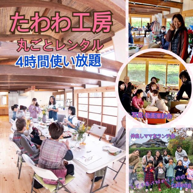 たわわの里のレンタルスペース「たわわ工房」(キッチン付き古民家125㎡・駐車場有)を4時間借り切ることが出来ます。ママ友会、同窓会、飲み会、朗読会、写真や動画撮影会、マルシェなどにお使い頂いています。野外調理場も野外調理場も使えます